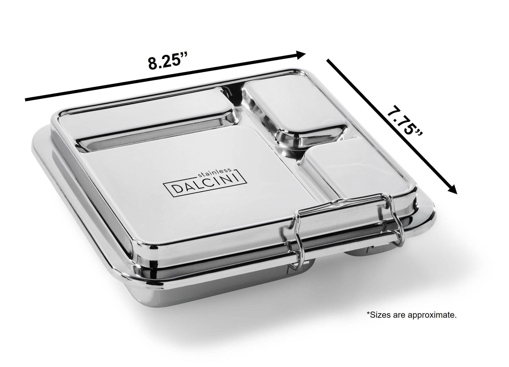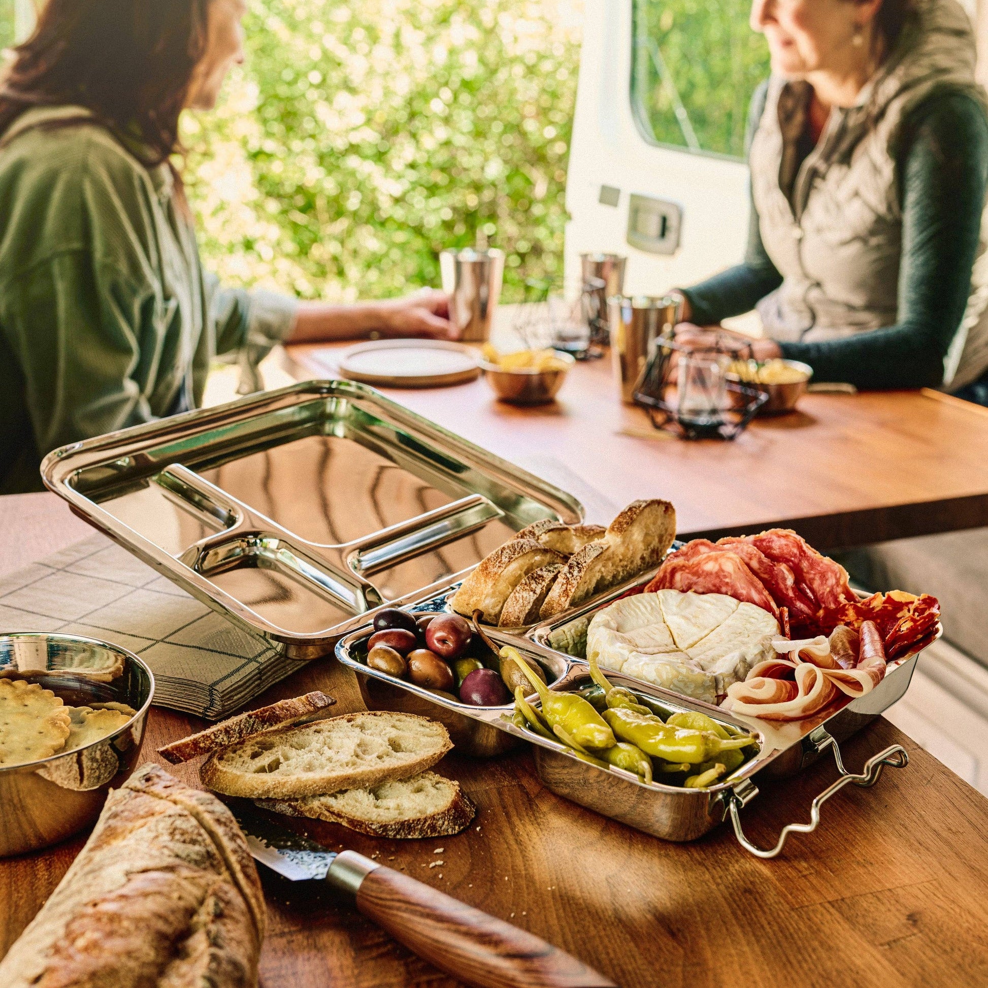 Stainless steel food storage container with a secure latch closure. Great for Charcuterie to-go, and Bento-style lunch. Dishwasher Safe.